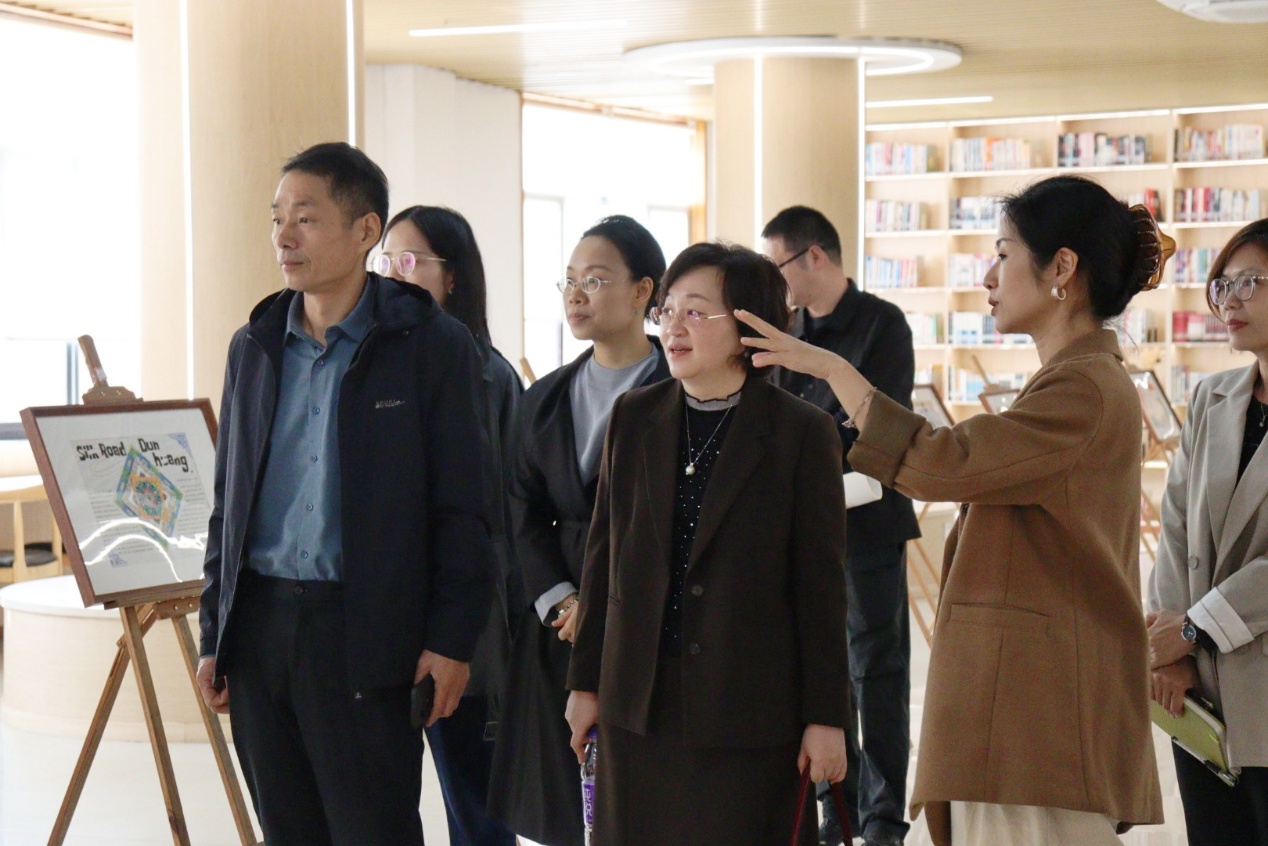在潘雅辉的陪同下,来访教师参观了图书馆举办的“丝路新篇·文化共绘:第一届国际文化交流周”及“走近经典 传承文化”学生优秀作品展。展陈中,学生制作的英文手抄报、短视频等第二课堂成果,充分展现出我校学子扎实的英语语言功底与良好的综合素养。